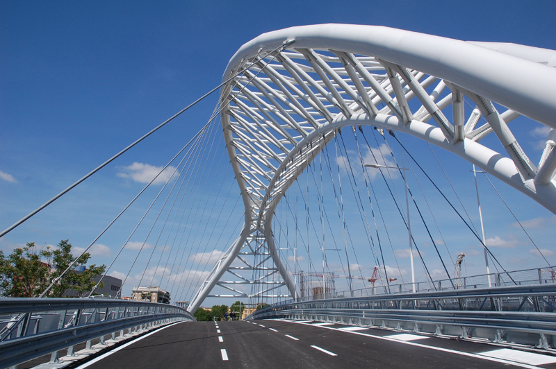 Il Ponte Settimia Spizzichino, esempio di design minimalista e contemporaneo, si distingue per la sua struttura reticolare che richiama visivamente il vicino Gazometro, simbolo dell’archeologia industriale romana. Il ponte è stato inaugurato nel 2011 e un anno dopo è stato dedicato a Settimia Spizzichino. L’intitolazione a Settimia Spizzichino – unica donna sopravvissuta al campo di Auschwitz tra gli ebrei rastrellati a Roma nel 1943 – aggiunge un forte valore simbolico alla modernità del ponte. Inaugurato nel 2012, collega Ostiense e Garbatella, due quartieri centrali nella vita culturale e sociale della Capitale. Progettato da Francesco Del Tosto, il ponte si estende per 240 metri, con un tratto sospeso di 125 metri sorretto da due archi bianchi e funi d’acciaio disposte a raggiera. La struttura, funzionale e scenografica, ospita sei corsie stradali, trasporto pubblico, piste ciclabili e passaggi pedonali. L’illuminazione notturna esalta le sue linee fluide, rendendolo un landmark urbano di grande impatto visivo e memoria storica.